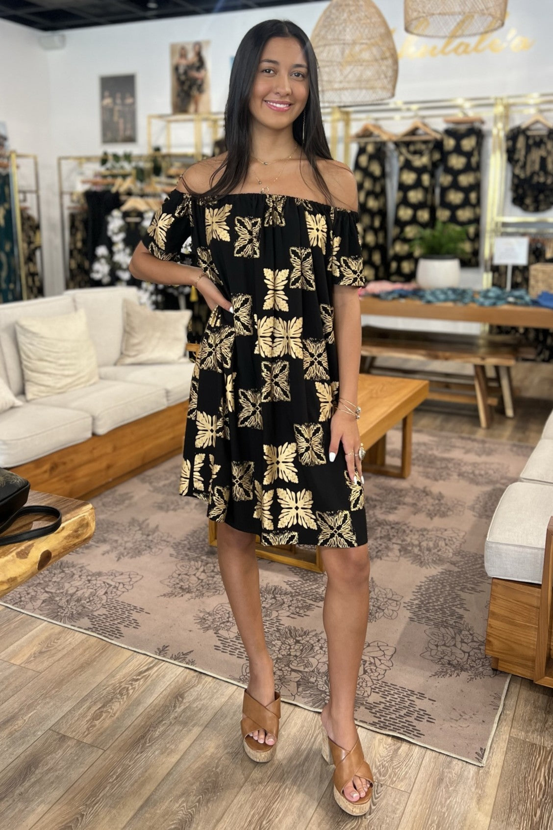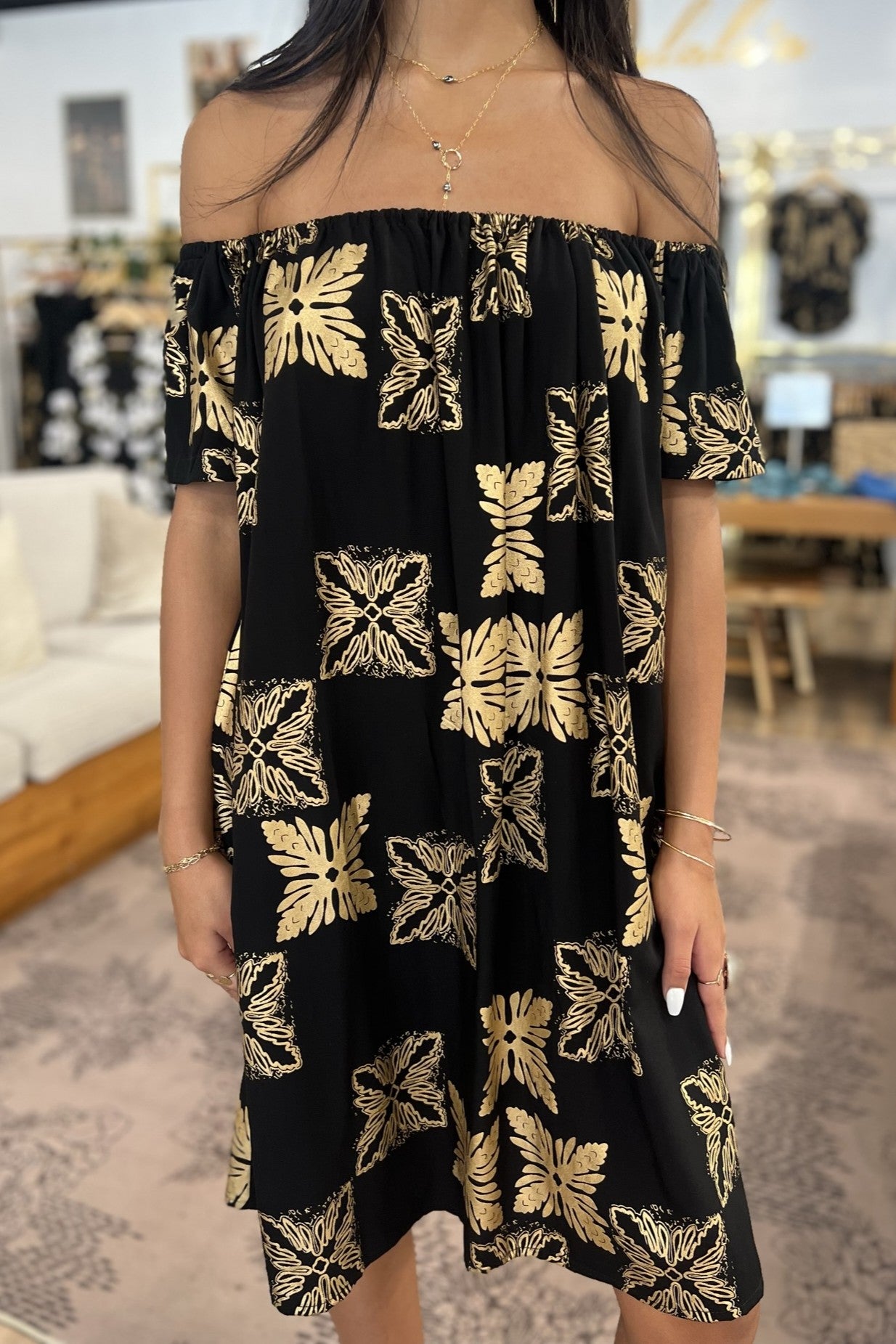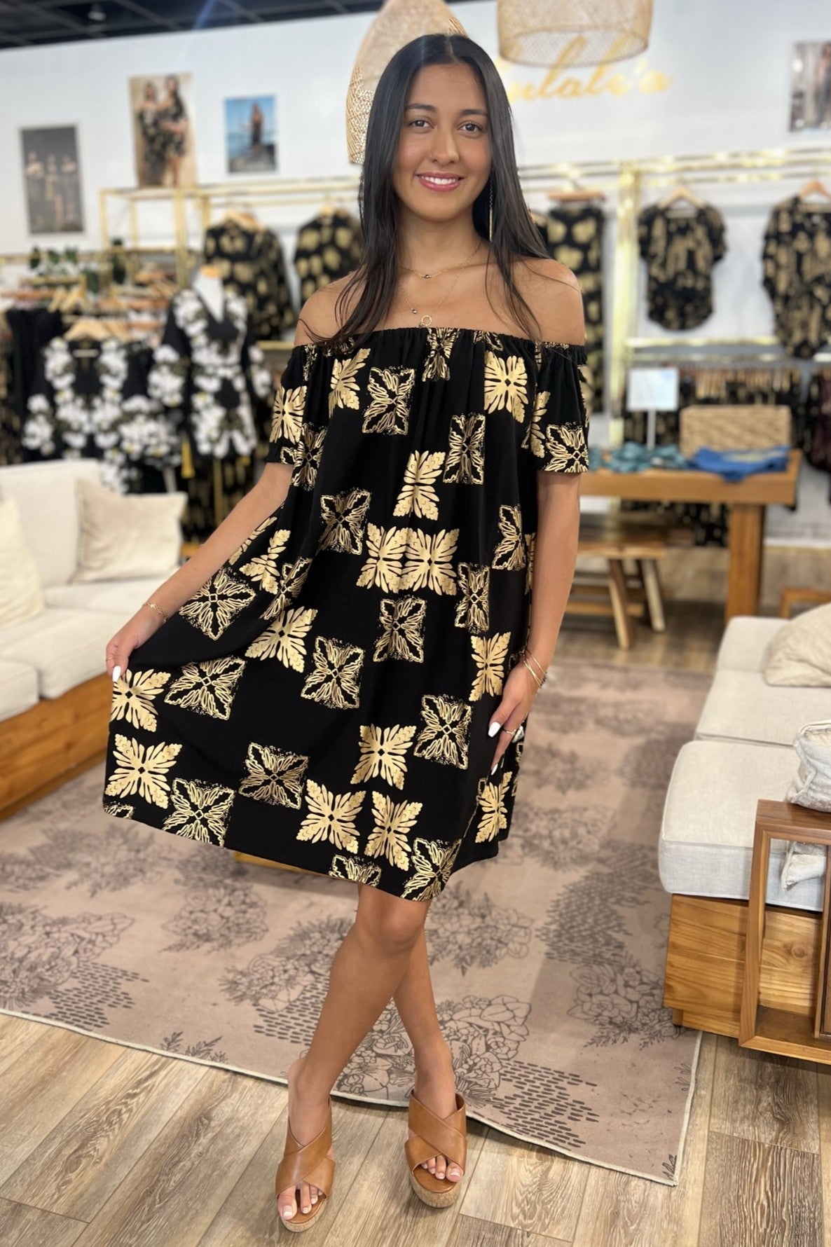In the Black Gold Tutu’s Quilt colorway, the bold quilt-inspired motifs in warm gold stand out against a black backdrop for a striking statement. The breathable rayon fabric allows the dress to drape naturally, making it an easy choice with sandals for daytime or styled slightly dressier for evening plans.