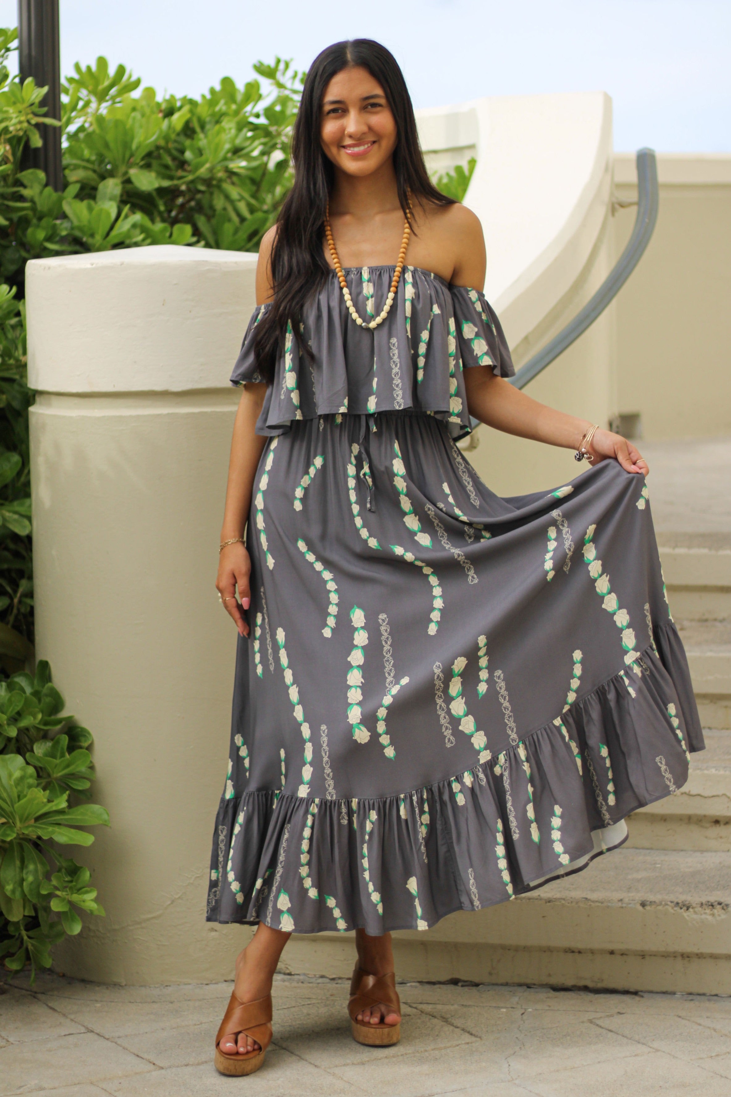 Our Nainoa Top is an off-the-shoulder style that’s comfortable and easy to wear throughout the day. Made from lightweight rayon, it features an elastic neckline and short, loose sleeves that let you wear it on or just below the shoulders.