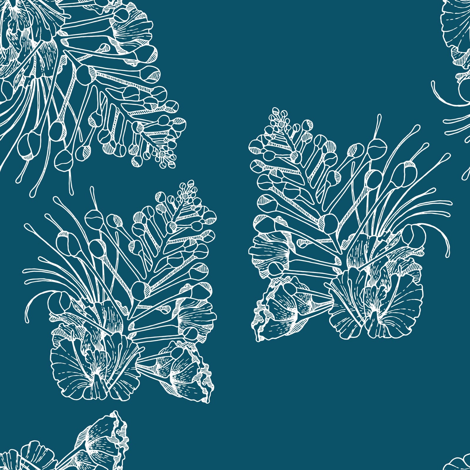 The second print release in our newest collection is inspired by the endemic Hawaiian morning glory plant, Pā‘ū O Hi‘iaka. Translated to the “skirt of Hi‘iaka,” there are multiple mo‘olelo that are connected to this coastal crawling vine. In one legend, it describes how Pele brought her baby sister, Hi‘iaka, with her to the beach to go surfing. As Pele is surfing, Hi‘iaka, who is on the beach, becomes uncomfortable from the hot sun, and the small vine-like plant grows over her to provide shade. In her later life, another legend states that Pele sends Hi‘iaka on an epic journey to search for Pele’s lover, and she is adorned with a magical skirt, Pā‘ū O Hi‘iaka, to help protect and guide her on her journey.